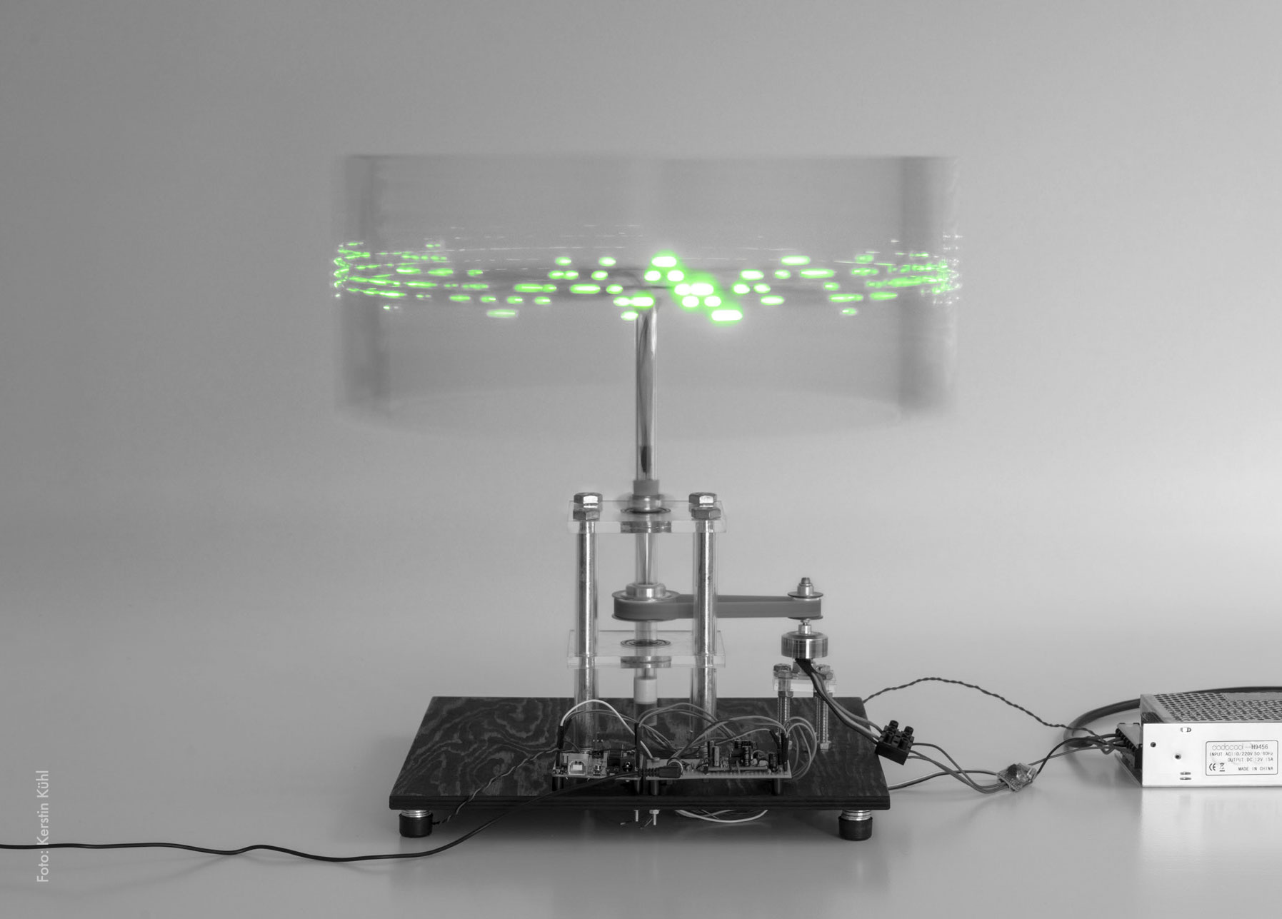 In einer raumgreifenden Installation, dem „Klang-Wissen-Apparat“, bestehend aus zehn Exponaten, wird ein kaleidoskopischer Blick auf die Erfahrung und Verarbeitung von Klang eröffnet. Das Auftauchen, Fluktuieren, Transformieren und Fixieren von Klang wird auf verschiedenen Wahrnehmungsebenen thematisiert bzw. visualisiert und erfahrbar gemacht. Die Exponate sind durch Querverweise und Zitate in den natur- bzw. kulturwissenschaftlichen Kontext der Klangforschung und -erfahrung eingebettet.