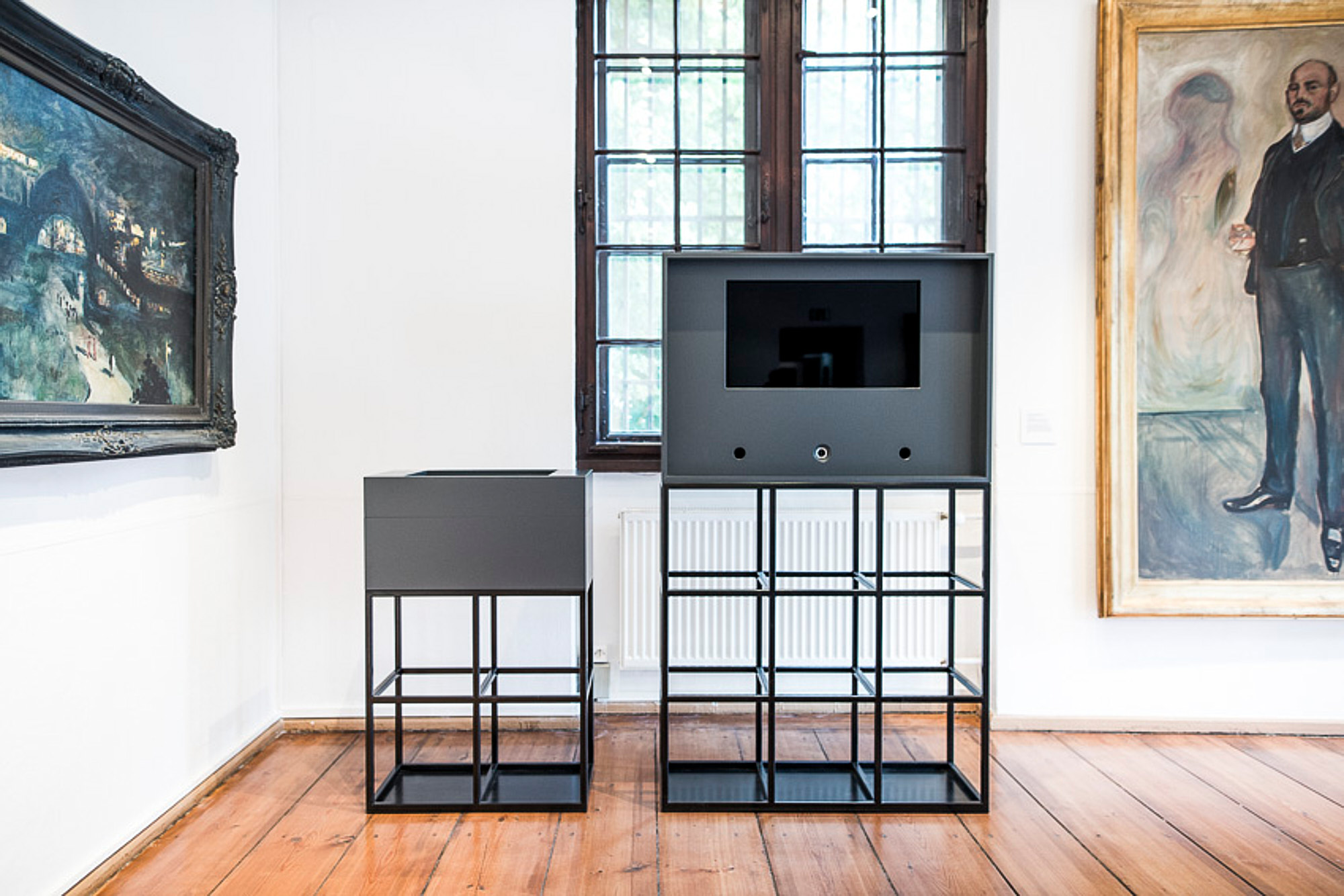 Eine Medienstation erklärt und veranschaulicht anhand eines Gemäldes von Lesser Ury (Bahnhof Nollendorfplatz bei Nacht, 1925) die Modernisierung Berlins Anfang des 20 Jahrhunderts. Die aus dem Möbel nehmbaren Würfel stehen für verschiedene Themenaspekte, steuern diese auf dem Screen an und bieten spielerische Möglichkeiten des Informationsabrufs.