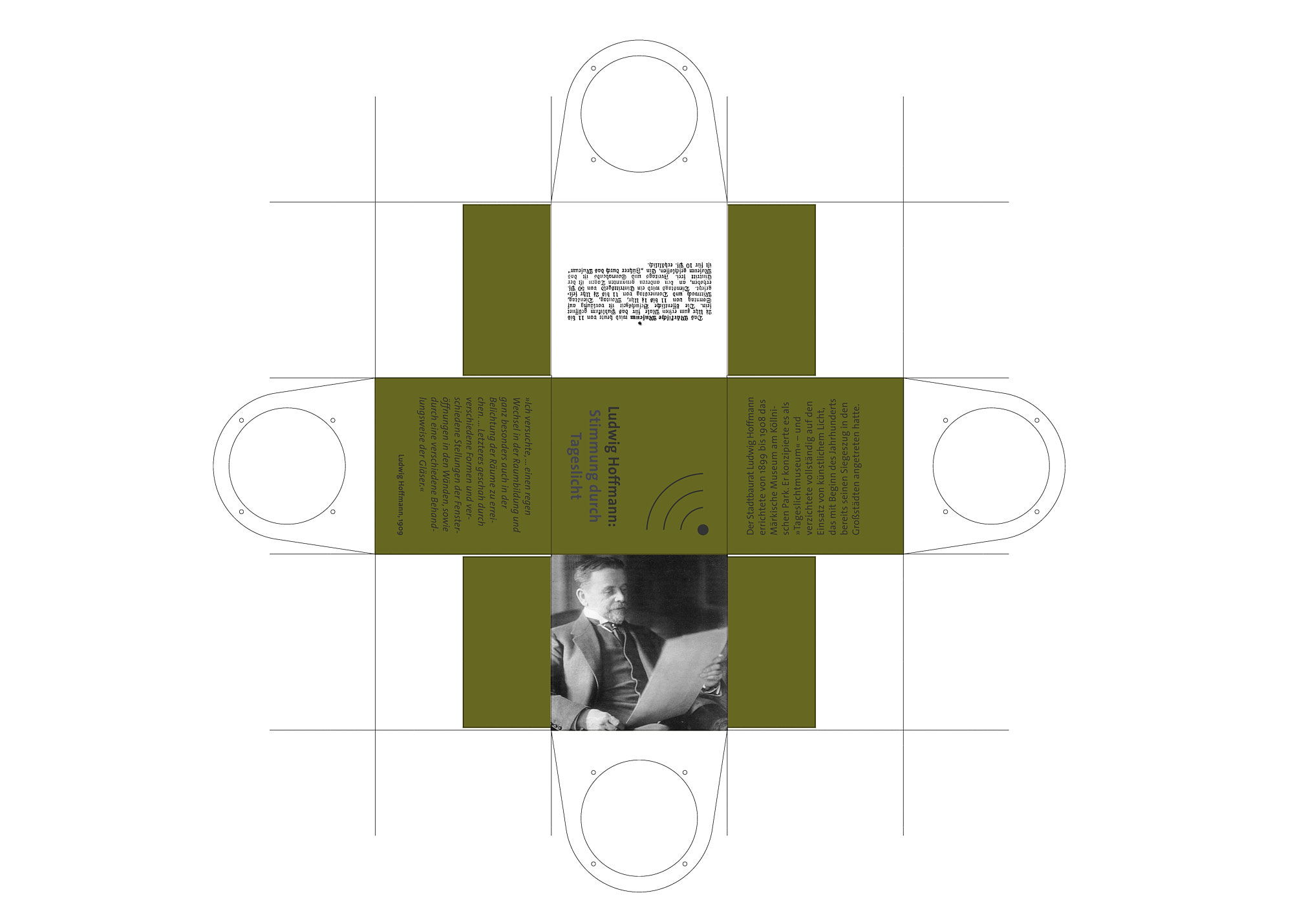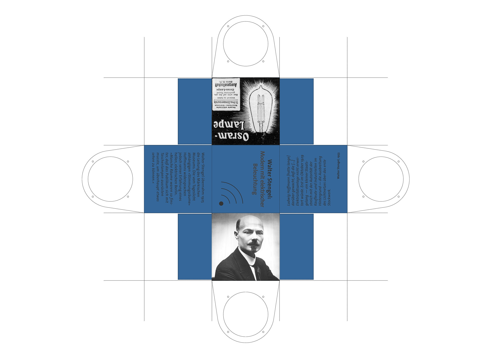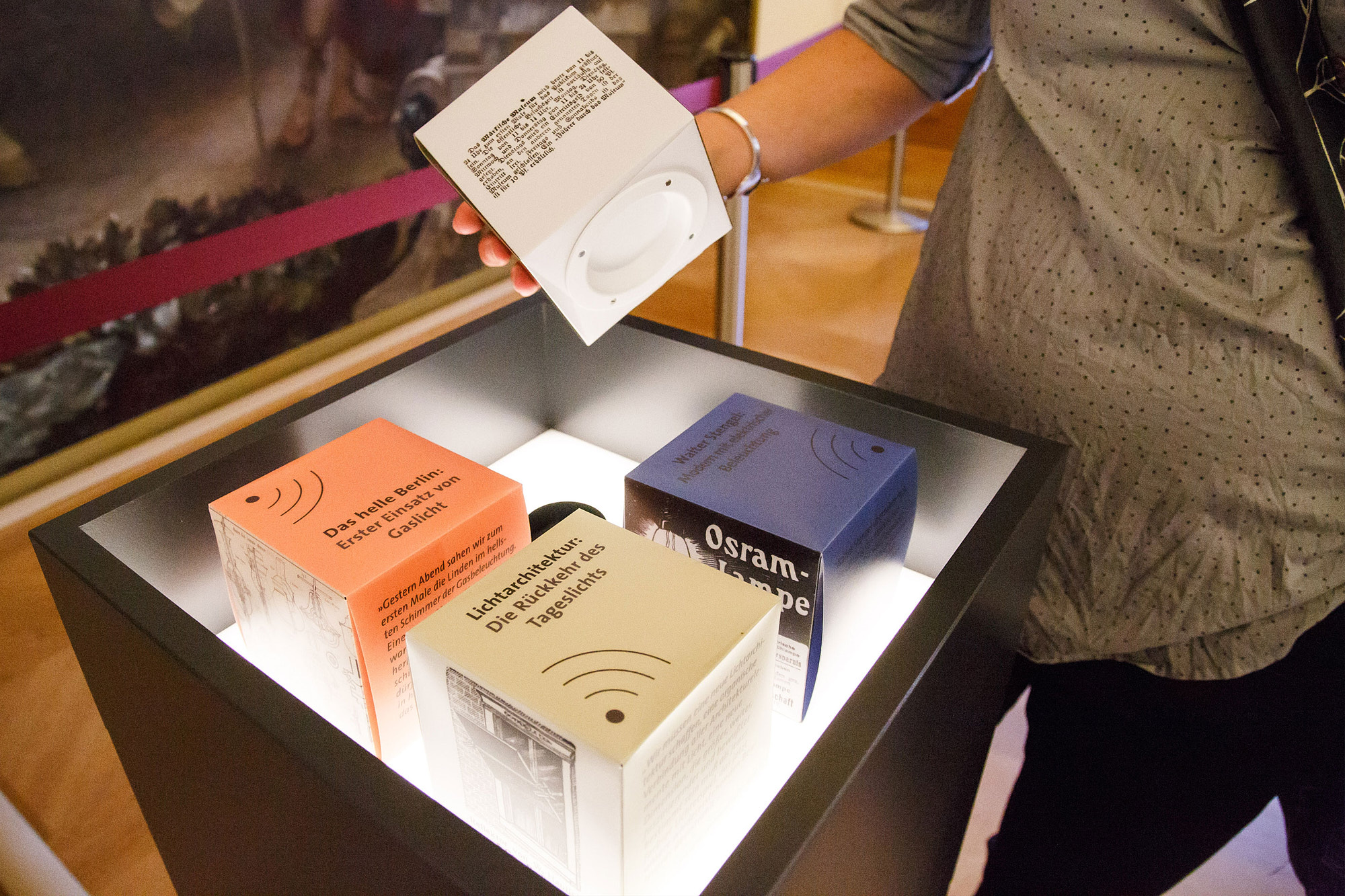 Die Diskussion vierer historischer Persönlichkeiten über die Elektrifizierung Berlins Anfang des 20. Jhd. wird in den Raum übertragen. In jeder Ecke des Hoffmann-Saals steht eine Audiosäule, die der Besucher mithilfe der Würfel zum sprechen bringen kann.