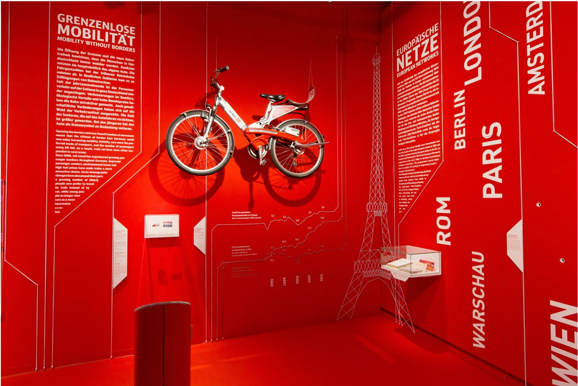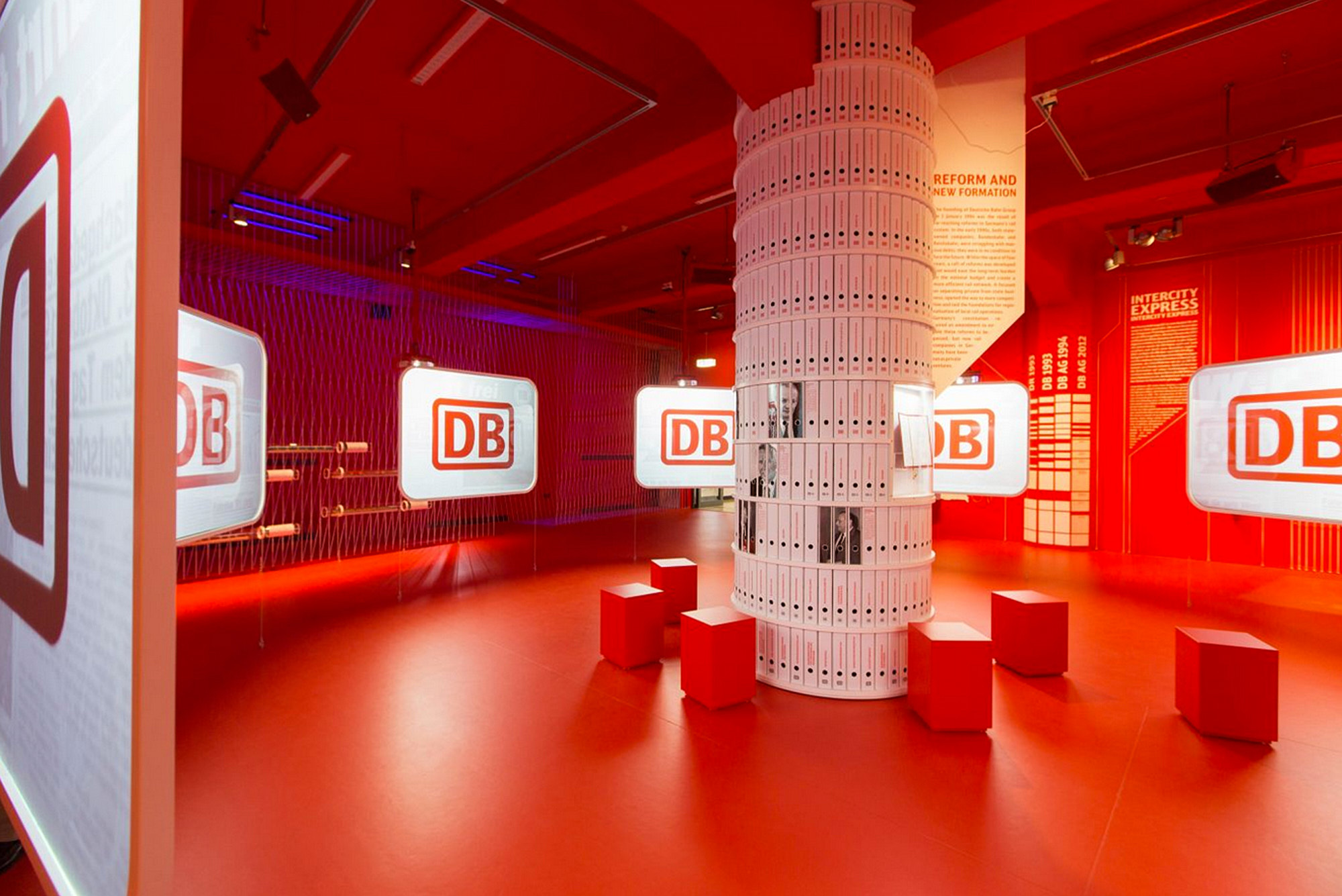 Die Zusammenführung der zwei Unternehmen, „Deutsche Bundesbahn“ und „Deutsche Reichsbahn“, sowie die Entwicklung hin zu einem modernen, digitalisierten und globalisierten Konzern sind über eine 360° Screen-Installation erlebbar. Diese ist umgeben von einem abstrakten Schienennetz, welches Exponate präsentiert, Diagramme visualisiert und sich zu Illustrationen verknüpft.