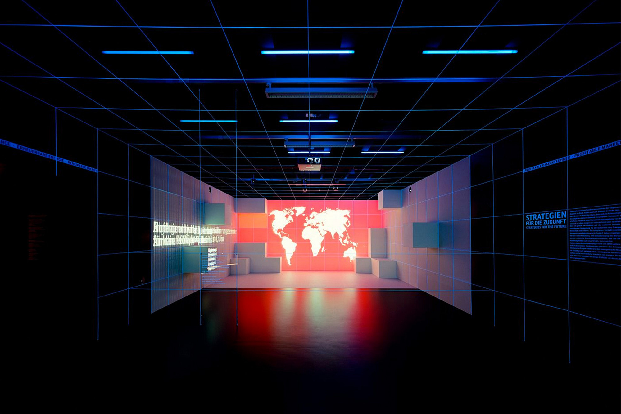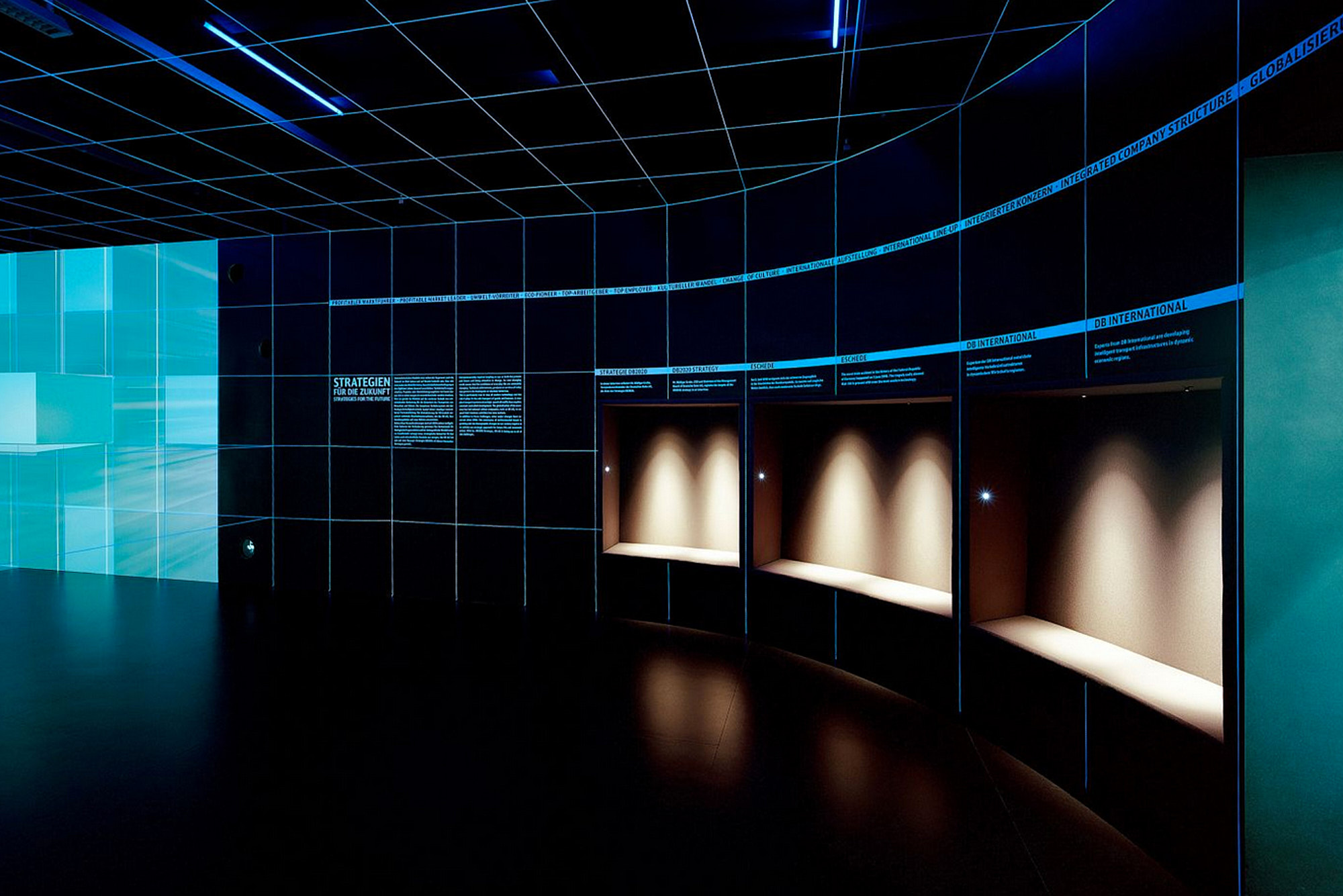 Im zweiten Teil der neuen Dauerausstellung, dem Strategieraum, geht der reale Raum fließend über in eine mittels 3D-Mapping-Technologie dynamisch animierte Visualisierung der „Konzernstrategie DB 2020“.